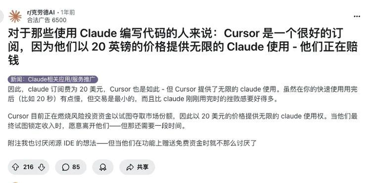 有分析师(Ed Zitron)指出,包括Cursor在内的几乎所有生成式AI软件公司,都面临深度亏损的现实。它们的产品只能以极低的或亏损的价格提供服务,无法覆盖模型调用支出和运营成本。Reddit社区也有人直言:Cursor的营收虽高,但扣除硬件、电力、算力、研发和客户支持等成本后,利润微乎其微。