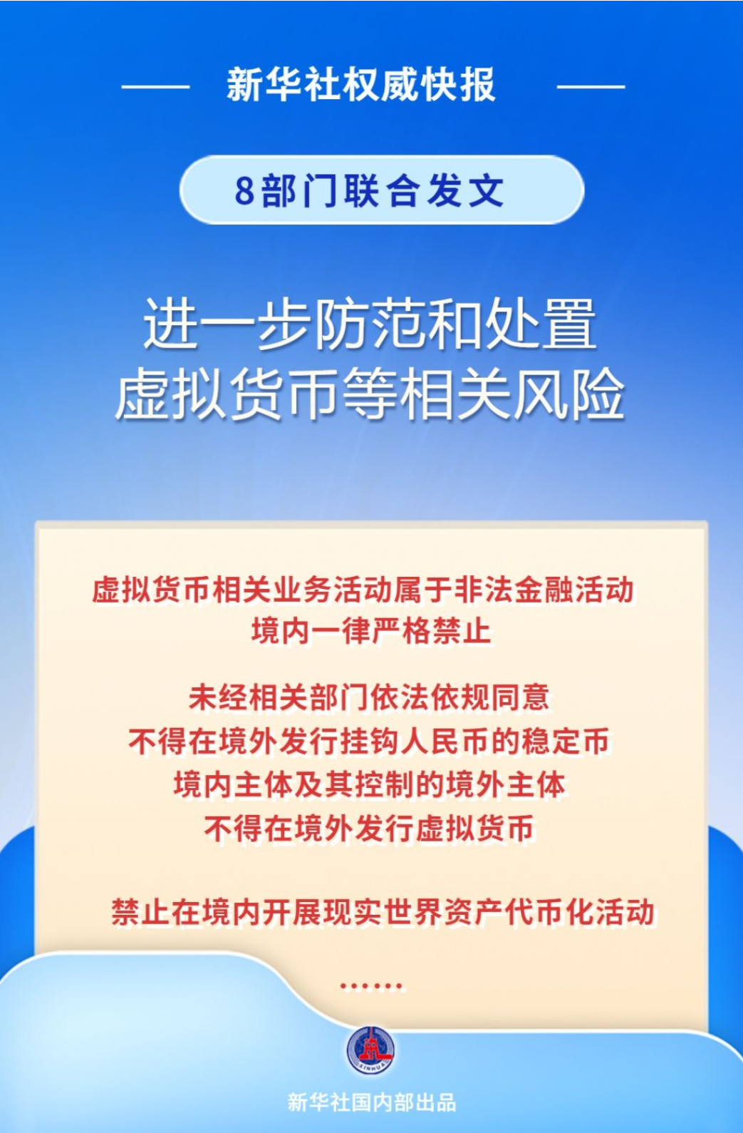 此次印发的《通知》还明确,国家发展改革委会同相关部门严格管控虚拟货币“挖矿”活动,全面梳理排查并关停存量虚拟货币“挖矿”项目,严禁新增“挖矿”项目,严禁“矿机”生产企业在境内提供“矿机”销售等各类服务。
